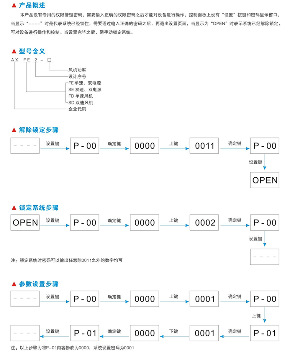 本產(chǎn)品設有專用的權限管理密碼,需要輸入正確的權限密碼之后才能對設備進行操作,控制面板上設有“設置"按鍵和密碼顯示窗口,當顯示“----"時是代表系統(tǒng)已經(jīng)鎖住,需要通過輸入正確的密碼之后,再退出設置頁面,當顯示為“OPEN" 時表示系統(tǒng)已經(jīng)解除鎖定,可對設備進行操作和控制。當設置完畢之后,需手動鎖定系統(tǒng)。